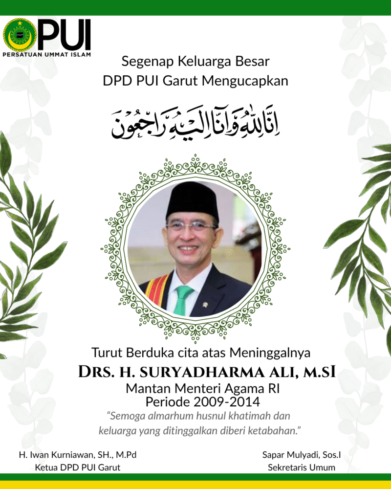 Garut, Jabar 60 detik.com Duka mendalam menyelimuti keluarga besar Dewan Pengurus Daerah (DPD) Persatuan Ummat Islam (PUI) Kabupaten Garut atas wafatnya H. Surya Dharma Ali, M.Si., mantan Menteri Agama Republik Indonesia periode 2009–2014, pada Kamis pagi pukul 04.25 WIB. Ucapan belasungkawa mengalir dari berbagai tokoh dan lembaga, termasuk dari Ketua DPD PUI Garut, H. Iwan Kurniawan, SH., M.MPd., yang menyampaikan langsung pernyataannya kepada awak media.