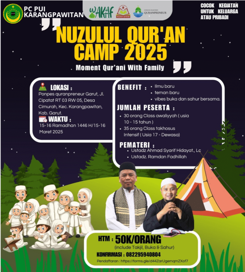 Bagi masyarakat yang ingin berpartisipasi dalam Nuzulul Quran Camp, dapat segera mendaftarkan diri melalui kontak resmi PC PUI Karangpawitan atau Pesantren Qur’an Preneur. Jangan lewatkan kesempatan emas ini untuk mengisi Ramadhan dengan cahaya Al-Qur’an bersama keluarga tercinta!